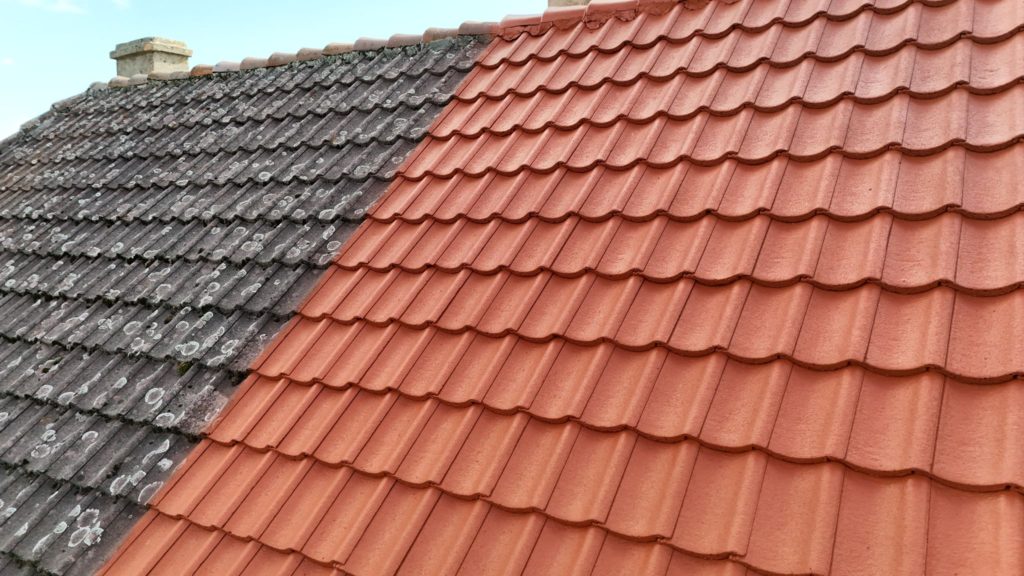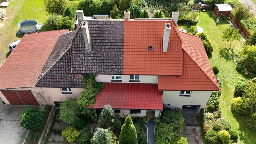 2. Czyszczenie Dachów: Wykonujemy czyszczenie wysokociśnieniowe dachu (min. 290 bar), usuwając wszelkie zanieczyszczenia, mech i porosty. To kluczowy etap, ponieważ dachówka betonowa jest bardzo porowata.